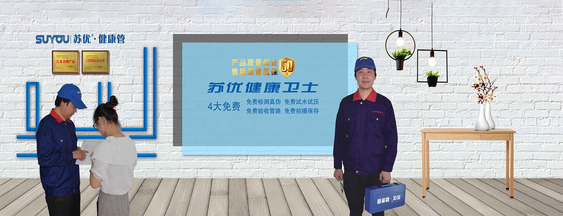 小區(qū)廣告—門頭立柱,墻體廣告,公交專線等精確投放。專業(yè)配套物料含:貨架,形象墻,展板,數(shù)顯焊機,剪刀,工作服,智能試壓機等,讓你打造蘇優(yōu)品牌得心應(yīng)手。